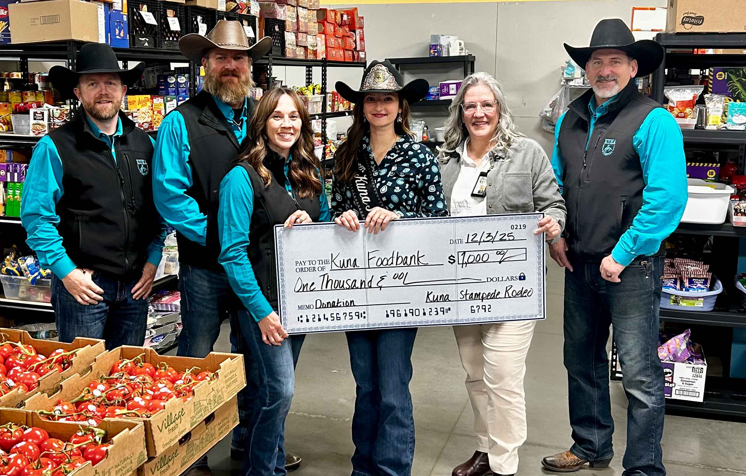 On Wednesday, December 3, 2025, members of the Kuna Stampede Rodeo presented a check to Kuna Food Bank Director, Marci Durrant. Thank you to members of the Kuna Stampede Rodeo for their generous donation to the Kuna Food Bank. Having excellent community partners like this allows us to continue the vital work we do in our community.