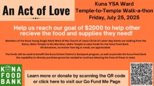 Members of the Kuna Young Single Adult Ward of the Church of Jesus Christ of Latter-day Saints walked from the Boise, Idaho, temple to the Meridian, Idaho, temple to raise funds for the Kuna Food Bank. Their efforts generated $2500 for the Kuna Food Bank!